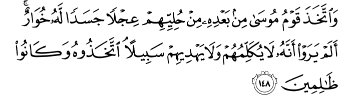 Translation: In his absence1 the people of Moses made from their ornaments the image of a calf which made sound like lowing. Did they not see that it could neither speak to them nor guide them in any matter? Yet they took it for a god, for they were wrong-doers.