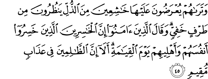photoTransliteration: Watarahum yuAAradoona AAalayha khashiAAeena mina alththulli yanthuroona min tarfin khafiyyin waqala allatheena amanoo inna alkhasireena allatheena khasiroo anfusahum waahleehim yawma alqiyamati ala inna alththalimeena fee AAathabin muqeemin
