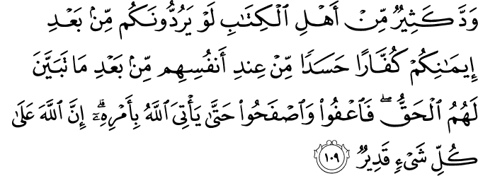 Translation: Many of the people of the Book desire to turn you anyhow back to unbelief. They wish this out of the envy of their hearts though the Truth has become quite clear to them. Yet, you should show forbearance and forgiveness to them till Allah Himself enforces His judgement. (Rest assured that) Allah has full power over everything: