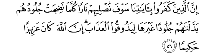 photoTransliteration: Inna allatheena kafaroo biayatina sawfa nusleehim naran kullama nadijat julooduhum baddalnahum juloodan ghayraha liyathooqoo alAAathaba inna Allaha kana AAazeezan hakeeman