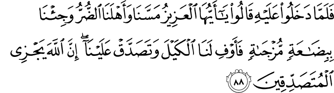 Translation: When they went back to Egypt and presented themselves before Joseph, they humbly. said, "Exalted sir! we and our family are in great distress: though we have been able to bring only goods of scant worth for barter, we request you to give us full measure of grain, and be charitable to us: for Allah rewards richly those who are charitable."