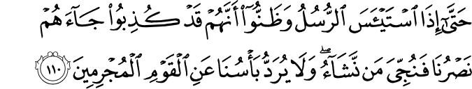 photoTransliteration: Hatta itha istayasa alrrusulu wathannoo annahum qad kuthiboo jaahum nasruna fanujjiya man nashao wala yuraddu basuna AAani alqawmi almujrimeena