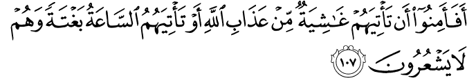 Translation: Do they feel secure that Allahs scourge shall not overwhelm them, or that the hour of Doom will not come upon them suddenly when they are unaware?