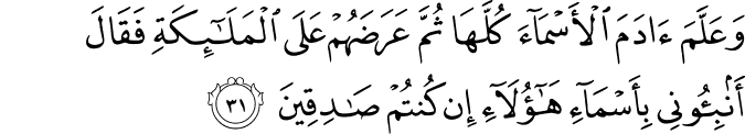 photoTransliteration: wa AAallama adama alasmaa kullaha thumma AAaradahum AAala almalaikati faqala anbioonee biasmai haolai in kuntum sadiqeena