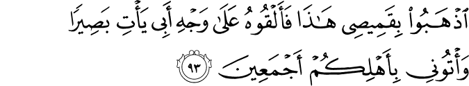 Transliteration: Ithhaboo biqameesee hatha faalqoohu AAala wajhi abee yati baseeran watoonee biahlikum ajmaAAeena