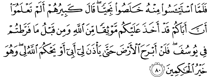 photoTransliteration: Falamma istayasoo minhu khalasoo najiyyan qala kabeeruhum alam taAAlamoo anna abakum qad akhatha AAalaykum mawthiqan mina Allahi wamin qablu ma farrattum fee yoosufa falan abraha alarda hatta yathana lee abee aw yahkuma Allahu lee wahuwa khayru alhakimeena