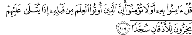 Translation: O Muhammad, say to these people, “Whether you believe in it or not, those who were given the knowledge before this, fall prostrate on their faces when it is recited to them
