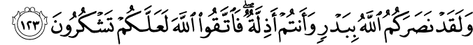 photoTransliteration: Walaqad nasarakumu Allahu bibadrin waantum athillatun faittaqoo Allaha laAAallakum tashkuroona
