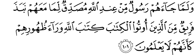 Translation: And whenever a Messenger came to them from Allah, confirming that Scripture which they already possessed, some from among the people of the Book threw the Book of Allah behind their backs as though they knew nothing about it.