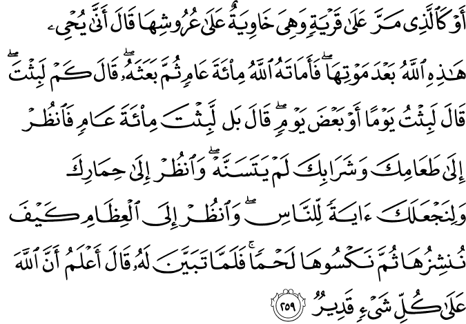 photoTransliteration: Aw kaallathee marra AAala qaryatin wahiya khawiyatun AAala AAurooshiha qala anna yuhyee hathihi Allahu baAAda mawtiha faamatahu Allahu miata AAamin thumma baAAathahu qala kam labithta qala labithtu yawman aw baAAda yawmin qala bal labithta miata AAamin faonthur ila taAAamika washarabika lam yatasannah waonthur ila himarika walinajAAalaka ayatan lilnnasi waonthur ila alAAithami kayfa nunshizuha thumma naksooha lahman falamma tabayyana lahu qala aAAlamu anna Allaha AAala kulli shayin qadeerun