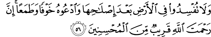photoTransliteration: Wala tufsidoo fee alardi baAAda islahiha waodAAoohu khawfan watamaAAan inna rahmata Allahi qareebun mina almuhsineena