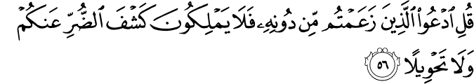 Translation: Say to them, "You may invoke for help those deities whom you consider to be (your helpers) beside Allah: They will not be able to relieve you of any trouble nor change it."