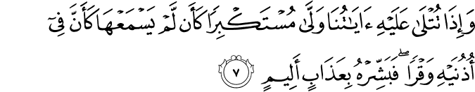 Translation: When Our Revelations are recited to huh, he turns his face away disdainfully as though he did not hear theta, as though his ears were deaf. Well, give him the good news of a painful torment.