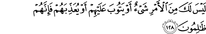 photoTransliteration: Laysa laka mina alamri shayon aw yatooba AAalayhim aw yuAAaththibahum fainnahum thalimoona