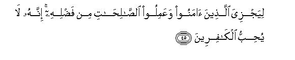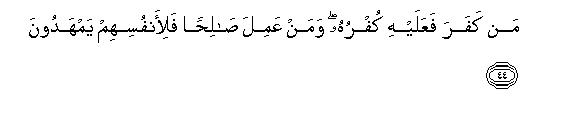 [44-45] The one who has disbelieved, will bear the burden of his disbelief,67 and those who have acted righteously, are indeed preparing the way for their own true success, so that Allah may reward with His bounty those who believed and did good works. Surely He does not like the disbelievers.