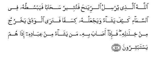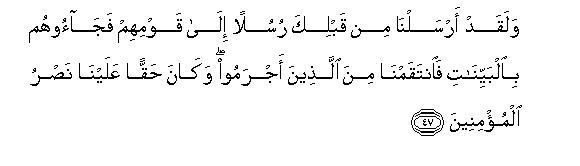 [46-47] Of His Signs is this that He sends the winds to give good news68 and to bless you with His Mercy and to make the ships sail by His Command,69 so that you may seek His bounty70 and be grateful to Him. And We sent before you Messengers to their peoples who came to them with clear Signs.71 Then We took vengeance on the guilty ones72 and it was their right on Us that We should help the believers.
