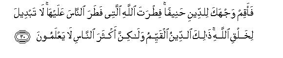[30-32] So,42 (O Prophet and the followers of the Prophet,) set your face sincerely and truly43 towards this Faith44 and be steadfast on the Nature whereupon Allah has created mankind.45 There can be no alteration in the Nature made by Allah.46 This is the right and true Faith,47 but most people do not know. (Be steadfast on this) turning wholly towards Allah,48 and fear Him,49 and establish the Salat,50 and do not be of the mushriks who have set up their separate creeds and divided themselves into sects, each sect rejoicing in what it has.51