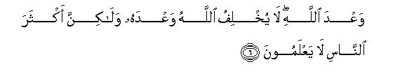 [1-6] Alif. Lam. Mim. The Romans have been overcome in the neighboring land,1 and within a few years after their defeat, they shall be victorious. Allah's is the authority before as well as afterwards.2 And it will be the day when the believers will rejoice in the victory granted by Allah.3 Allah helps whomsoever He wills: He is the All-Mighty, the All-Merciful. This is Allah's promise: Allah never breaks His promise; but most people do not know.
