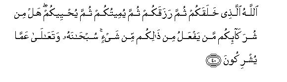 [40-43] Allah61 it is Who created you, then provided for you,62 then He causes your death, and then He will bring you back to life. Is there among the associates you have set up (with Allah) anyone who can do any of these things?63 Glorified is He and far exalted above the shirk these people commit. Mischief has appeared in the land and the sea on account of men's own doings that He may make them taste same of their (evil) works: maybe they mend their ways.64 (O Prophet,) say to them, "Go about in the land and see what has been the end- of those who lived before (you). Most of them were mushriks (idolaters).65 So, (O Prophet,) set your face firmly towards the true Faith before that Day arrives of which there is no chance of being averted by Allah.66 On that Day people will break asunder.