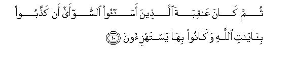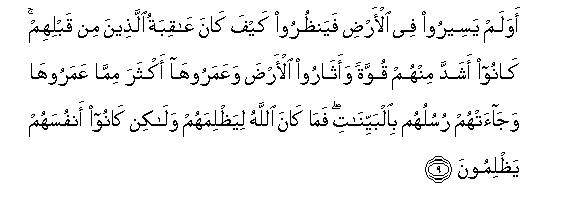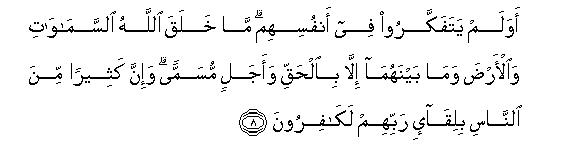 [7-10] The people only know the outward aspect of the worldly life, and of the Hereafter they are heedless.4 Have they never reflected in their own selves?5 Allah has created the earth and the heavens and all that lies between them, with the truth, and only for an appointed term;6 but most people disbelieve in the meeting with their Lord.7 And have they never traveled in the earth that they could see the end of those who have gone before them?8 They were mightier than these in strength: they tilled the land9 and built more on it than these people have.10 Their Messengers came to them with clear Signs.11 then it was not Allah Who was unjust to them, but it was they who were being unjust to themselves.12 At last, evil was the end of those who had committed' evil because they had denied the Revelations of Allah and scoffed at them.