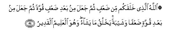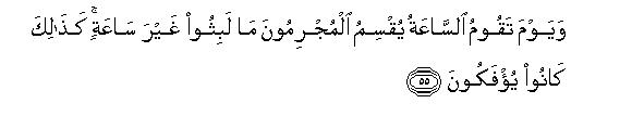 [54-57] Allah it is Who originated your creation from a state of weakness; then He gave you strength after that weakness; then made you weak and old after that strength. He creates whatever He wills.79 He knows everything and has power over everything. And when the Hour is established,80 the criminals will swear that they had not stayed for more than an hour;81 thus they used to be deceived in their worldly life.82 But those who had been given knowledge and faith, will say, "You have stayed, according to the book of Allah, till the Day of Resurrection: so this is the same Day of Resurrection, but you did not know." So, on that Day, the excuse of the wicked will not avail them anything, nor will they be asked to seek forgiveness.83