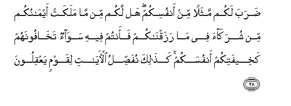 [28-29] He draws39 out a comparison for you from your own selves: Are there among the slaves that you possess any such slaves also who may be sharing with you equally the wealth that We have given you, and you fear them as you fear one another among yourselves?40 Thus do We present the Revelations clearly for those who use their common sense. But the wrongdoers are following their own desires, without any knowledge. Now, who can guide the one whom Allah has led astray?41 Such people can have no helper.