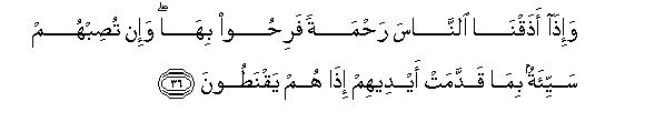 [36-39] When We make the people taste mercy, they exult at it; and when an affliction befalls them on account of their own misdeeds, they grow despondent.55 Do they not see that it is Allah Who gives abundantly to whom He wills and sparingly (to whom He wills)? Surely in this there are many Signs for those who believe.56 Therefore, (O believers,) give to your relative his due, and to the needy and the wayfarer (his due).57 This is the best way for those who seek Allah's goodwill: such alone will attain true success.58 The interest that you give in order to increase the wealth of the people, does not increase in the sight of Allah;59 and the Zakat that you pay in order to win Allah's approval, its payers do indeed increase their wealth.60