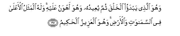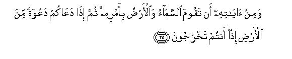 [25-27] And of his Signs is this that the Heaven and the Earth stand firm by His Command,36 then as soon as He summons you out of the earth, you shall come out at one call.37 Whoever exist in the heavens and the earth, are His servants; all are obedient to Him. He it is Who originates the creation; then He alone will repeat it, and this is easier for Him.38 His are the most exalted attributes in the heavens and the earth, and He is the All-Mighty, the All-Wise.