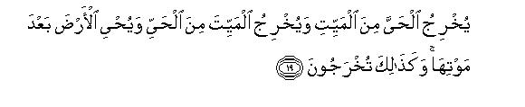 [17-19] So,22 glorify Allah23 in the evening and in the morning: praise is due to Him alone in the heavens and the earth; and (glorify Him) in the afternoon and at the declining of the day.24 He brings out the living from the dead and the dead from the living, and gives life to the earth after its death.25 Likewise, you too, shall be taken out (of the state of death).