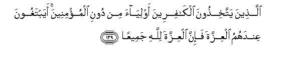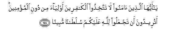 [144-145] O Believers, do not take the disbelievers as your friends instead of the Believers: do you ant to furnish Allah with a clear proof against yourselves? Note it well that the hypocrites shall go to the lowest abyss of Hell, and you will not find any helper for them.