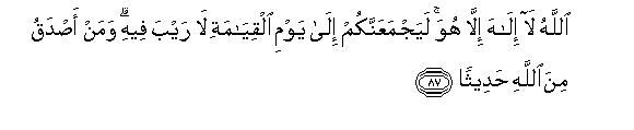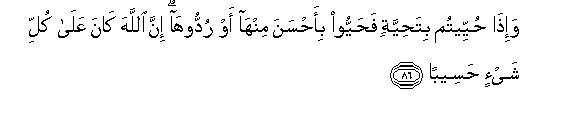 [86-87] And when anyone greets you in a respectful manner, greet him with a better salutation than his or at least return the same;114 indeed Allah takes count of everything. Allah: there is no deity but He. He will gather you all together on the Day of Resurrection, the coming of which is beyond all doubt: and whose word can be truer than Allah's.115