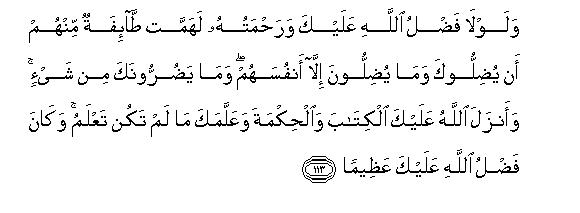 [113] O Prophet, had not Allah's grace been with you, and had not His .mercy safeguarded you from their mischief, a party from among them had decided to involve you in misunderstanding though they were involving no one but themselves in misunderstanding and could have done you no harm.142 Allah has sent down the Book and the Wisdom to you and taught what you did not know; great indeed is His bounty to you.