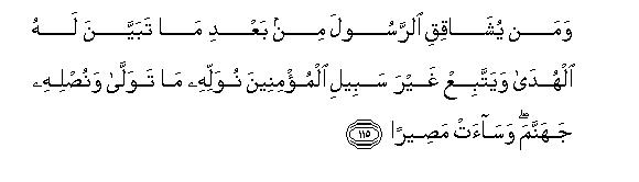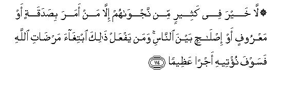 [114-115] There is nothing good in most of the secret counsels of the people: it is, however, a good thing if one secretly enjoins charity or righteousness or says something in order to set aright the affairs of the people; We will give a great reward to him who does so to please Allah. But as regards him who is bent on opposing the Messenger and is following a way other than that of the Believers after Guidance has become clear to him, We will turn such a one on the way to which he himself has turned,143 and cast him into Hell which is the most wretched abode.