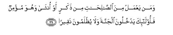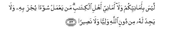 [123-124] The final result shall not be in accordance with your wishes nor in accordance with the wishes of the people of the Book. He who does evil shall be recompensed for it and he shall find no protector and no helper for himself against Allah. And the one who does good deeds, whether man or woman, provided that the one is a believer, will enter Paradise and they will not be wronged in the least of their rightful reward.