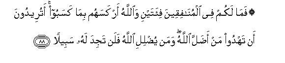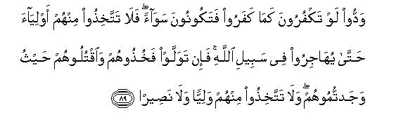 [88-91] How is it with you that there are two opinions among you concerning the hypocrites,116 whereas Allah has turned them back (to their former state) because of the evils they have earned?117 Do you desire to show guidance to him whom Allah has let go astray? You cannot find a path for him whom Allah has turned away from the right path. They really wish that you should also become disbelievers, as they themselves are so that both may become alike. So you should not take friends from among them unless they migrate in the way of Allah; and if they do not migrate, then seize them wherever you find them and slay118 them and do not take any of them as friends and helpers. However, those hypocrites are excepted who join a people who are allied to you by a treaty.119 Likewise, those hypocrites are excepted who come to you and are averse to fighting either against you of against their own people. Had Allah willed, He would have given them power over you and they also would have fought against you; therefore if they leave you alone and desist from fighting against you and make overtures for peace to you, in that case Allah has left you no cause for aggression against them. You will also find another kind of hypocrites, who wish to be at peace with you and also at peace with their own people but who would plunge into mischief, whenever they got an opportunity for it. If such people do not desist from your enmity nor make overtures for peace nor desist from fighting against you, then seize them and slay them wherever you find them, for We have given you a clear authority to fight against them.