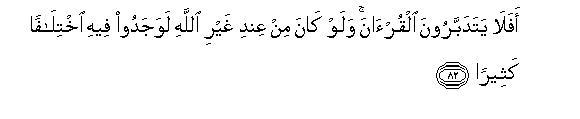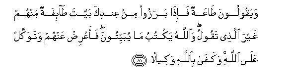 [81-82] In your presence, they say, "We are obedient to you," but when they leave you, some of them meet together secretly at night to plot against what you say; Allah writes down all their secret talks; so leave them alone and trust in Allah; Allah alone suffices for trust. Do they not ponder over the Qur'an? Had it been from any other than Allah, surely there would have been many contradictions in it.111