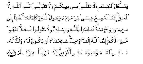 215The Christians have been rebuked for their wrong belief in the doctrine of the Trinity and advised to refrain from transgression. Strange though it may appear, the fact is that the Christians believe both in the Oneness of God and in the Trinity at one and the same time; for no Christian can deny that according to the clear sayings of Jesus in the Gospels, God is One Being and there is no other god than He. They cannot but admit that Unity of God is the real basis of religion. But the introduction of the doctrine of the Logos at an early stage of Christianity misled them into believing in the Godhead of Christ in union with God and the Holy Ghost. Since then it has always remained an enigma for them to reconcile these two contradictory doctrines and for the last eighteen hundred years or so the Christian scholars have been vainly engaged in solving this self-created baffling puzzle. Not only this, many Christian denominations have been founded upon different interpretations of this doctrine and it has given rise to many religious disputes in which one denomination accuses the other of blasphemy. In short, their scholars and interpreters have been spending all their efforts and energies in solving this enigma which was neither created by God nor by Christ. It is also obvious that there is no solution to it, because no one can prove that three persons share Godhead and also that God is One Being and has no partners in His Godhead. As this enigma is the result of their own transgression beyond the Divine limits, it can only be solved if they refrain from going beyond the limits and give up the belief of the Godhead of the Messiah and of the Holy Ghost, and acknowledge Allah as the sole object of worship, adoration and devotion and believe in the Messiah as a Messenger of God and not as a partner in the Godhead of Allah.