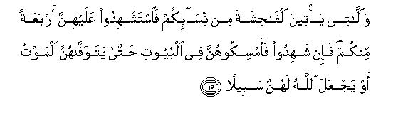 [15-16] If any of your women be guilty of indecency, call for four witnesses from among yourselves to testify against them: If they give evidence and prove the guilt, then confine them to their houses until death comes to them or Allah opens some other way out for them .And punish the two of you who commit this crime; then if they both repent and reform themselves, leave them alone,for Allah is generous in accepting repentance, and merciful in forgiving sins.26
