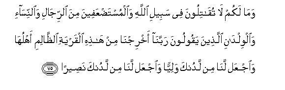 [73-76] And if you are blessed with grace from Allah, they say, as though there never had been any friendly relations between you and them "We wish we had also accompanied them and thus would have gained our end." (Let such people understand that) those alone, who barter away this worldly life for that of the Hereafter,103 should fight in the way of Allah; then We will bestow a great reward upon him who fights in the way of Allah whether he be slain or be victorious. Why should you, then, not fight in the way of Allah for the sake of those helpless men, women and children who, being weak, have been oppressed, and are crying out, "Our Lord, deliver us from this habitation whose inhabitants are unjust oppressors, and raise a protector for us by Thy grace and a helper from Thyself."104 Those, who follow the way of Faith, fight in the way of Allah, and those who follow the way of disbelief fight in the way of taghut.105 So fight against the helpers of Satan with this conviction that Satan's crafty schemes are in fact very weak.106