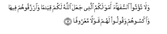 [5] Do not give to the feeble-minded people that property which Allah has made the means of your maintenance: you should however, provide them with food and clothing and give them good advice.8