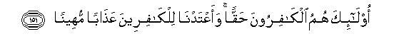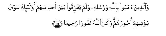 [150-152] Those, who deny Allah and His Messengers and desire to draw a line between Allah and His Messengers, and say, "We will acknowledge some and deny others," they seek a midway between belief and disbelief. All those are confirmed disbelievers,178 and We have prepared an ignominious punishment for such disbelievers. In contrast to them, We will most surely give their due reward179 to those who believe in Allah and all His Messengers and do not discriminate against any of them; for Allah is very Forgiving and very Compassionate.180