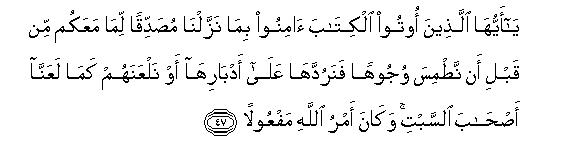 [47-48] O you to whom the Book had been given! Believe in the Book We have sent down now, confirming the Book you already have with you,77 believe in it before We distort faces and set them backwards, or lay Our curse on them as We laid Our curse on the Sabbath breakers:78 and remember that Allah's Command is surely carried into effect. Shirk is the only sin that Allah does not forgive,79 and He forgives whomsoever He pleases, other sins than this,80 for whosoever associates any other partner with Allah, does indeed forge a big lie and commit the most heinous sin.