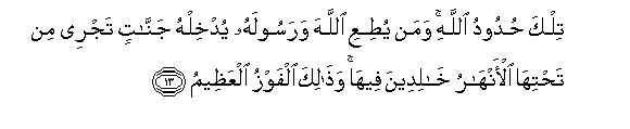 [13] These are the limits prescribed by Allah: whoever obeys Allah and His Messenger, He will admit him into the Gardens underneath which canals flow, wherein he will abide for ever; this is the great success.