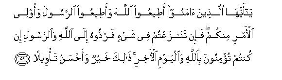 [59] O Believers, obey Allah and obey the Messenger and those entrusted with authority from among you. Then if there arises any dispute about anything, refer it to Allah and the Messenger,89 if you truly believe in Allah and the Last Day. This is the only right way and will be best in regard to the end.90