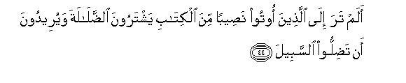 [44-46] Have you ever considered the case of those who have been given a portion of the scriptures?71 They themselves purchase deviation and wish you, too, to go astray from the Right Way: Allah knows your enemies well and Allah suffices you for protection and for help. Some of those, who have become Jews,72 pervert73 words out of their context and twist their tongues in order to malign the true Faith and say "sami 'ina74 wa 'asaina " and "Isma' ghaira musma `in75 and ''Ra 'ina76 . But, if they had said instead, "sami `ina wa ata "ana, " "Isma "' and " Unzurna," it would have been better for themselves and a more upright way. As Allah has cursed them for their disbelief, they are little disposed to believe.