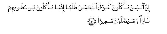 [9-10] Let the people apprehend and be afraid of this: how solicitous they would have been on the eve of their death about the helpless. children they would be leaving behind. They should, therefore, fear Allah and say the just and right thing. In fact, those who grab unjustly the property of the orphans, fill their bellies with fire, and most surely they shall be thrown into the burning fire of Hell.14