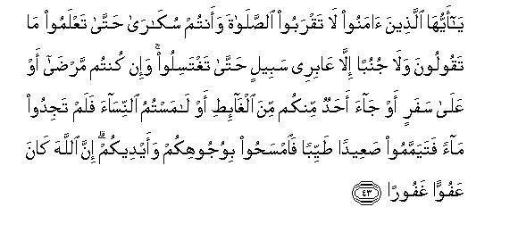 [43] O Believers, do not offer the Prayer while you are intoxicated,65 for Prayer should be offered only when you know what you are saying.66 Likewise, do not offer the Prayer if you are "unclean"67 until you take your bath, except when passing on the way:68 and if you are sick or on a journey .or if any one of you has relieved himself or you have touched69 women and can find no water, then cleanse yourselves with pure dust by rubbing it on your face and hands;70 no doubt Allah is Lenient and Forgiving.