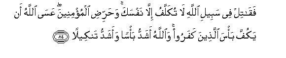 [84-85] O Prophet, fight in the way of Allah: you are accountable for none but your own person; you should, however, urge on the Believers to fight: it may be that Allah will soon break the strength of the disbelievers, for Allah is the strongest in might and His punishment is most severe. Whoever pleads a good cause, will get a share from it, and whoever pleads an evil cause also shall get a share from it;113 for Allah keeps strict watch over everything.