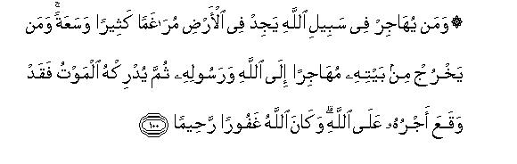 [97-100] When the angels seized the souls of those who were ding wrong to their own souls129 they asked them, "What was the matter with you?" They answered, "We were oppressed in the land." The angels replied, "Was not Allah's earth spacious for you to emigrate in it?"130 Hell is the abode of such people and it is a very evil abode indeed. As regards those men, women and children who are really helpless and lack the means of migration and find no way out, Allah may pardon them, for Allah is Forgiving and Forbearing. The one who emigrates in the way of Allah, will find in the land enough room for refuge and abundant resources for livelihood.. As regards the one, who leaves his home to migrate towards Allah and His Messenger and death overtakes him on the way, Allah has taken upon Himself to give him his due reward, for Allah is Forgiving and Merciful.131