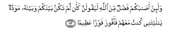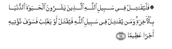 After this pre-requisite, they have been exhorted to make preparation for defense and to fight bravely for the cause of Islam, without showing any kind of cowardice or weakness. They have also been warned to be on their guard against hypocrites. A line of demarcation has been drawn to distinguish the intentional shirkers from the helpless devotees. 73 - 100